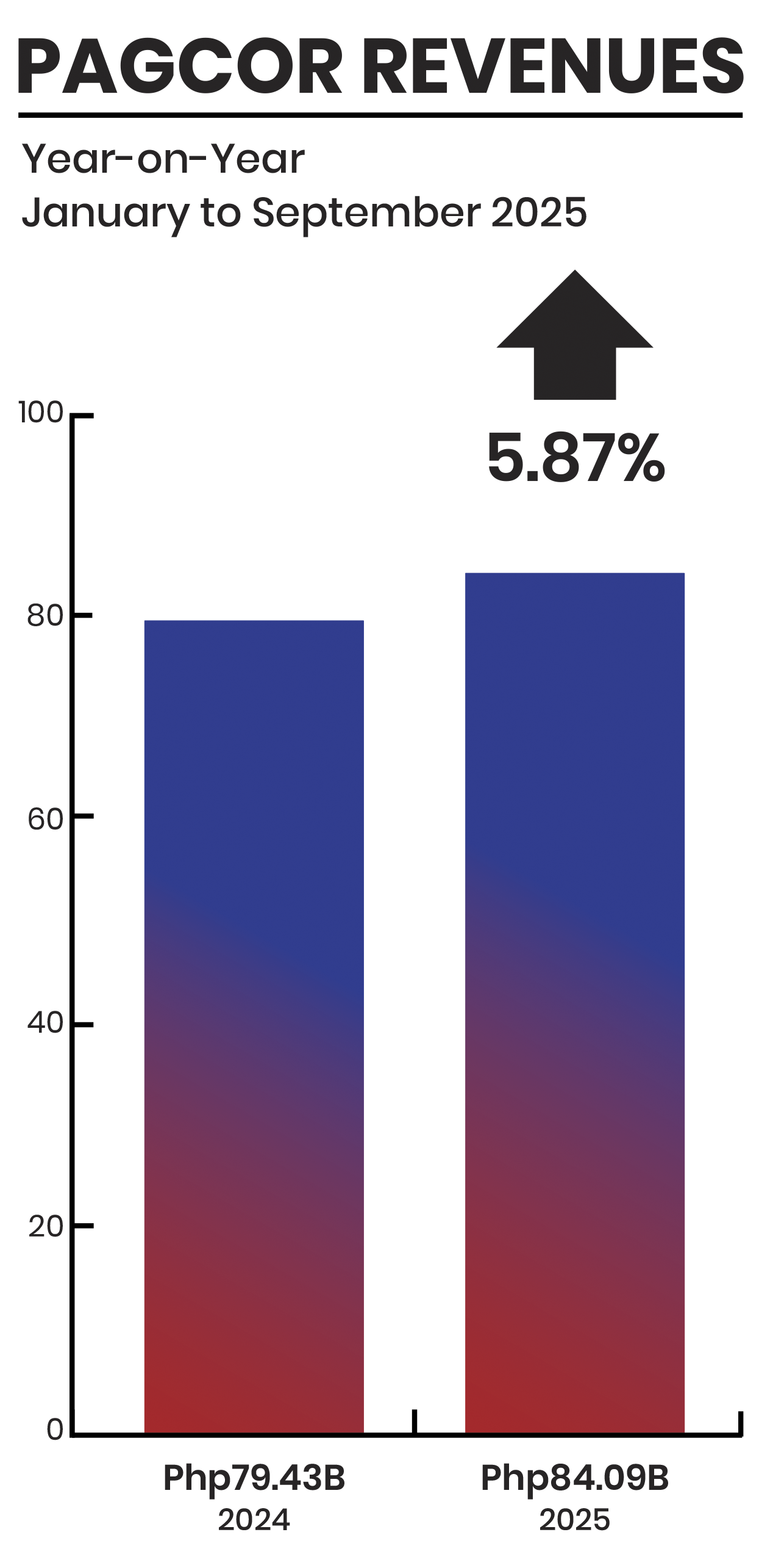 Total revenues from January to September was at Php84.09 billion, rising 5.87% year-on-year from Php79.43 billion. Gaming operations accounted for Php75.93 billion of the total revenues while other related services and other income contributed Php8.16 billion.